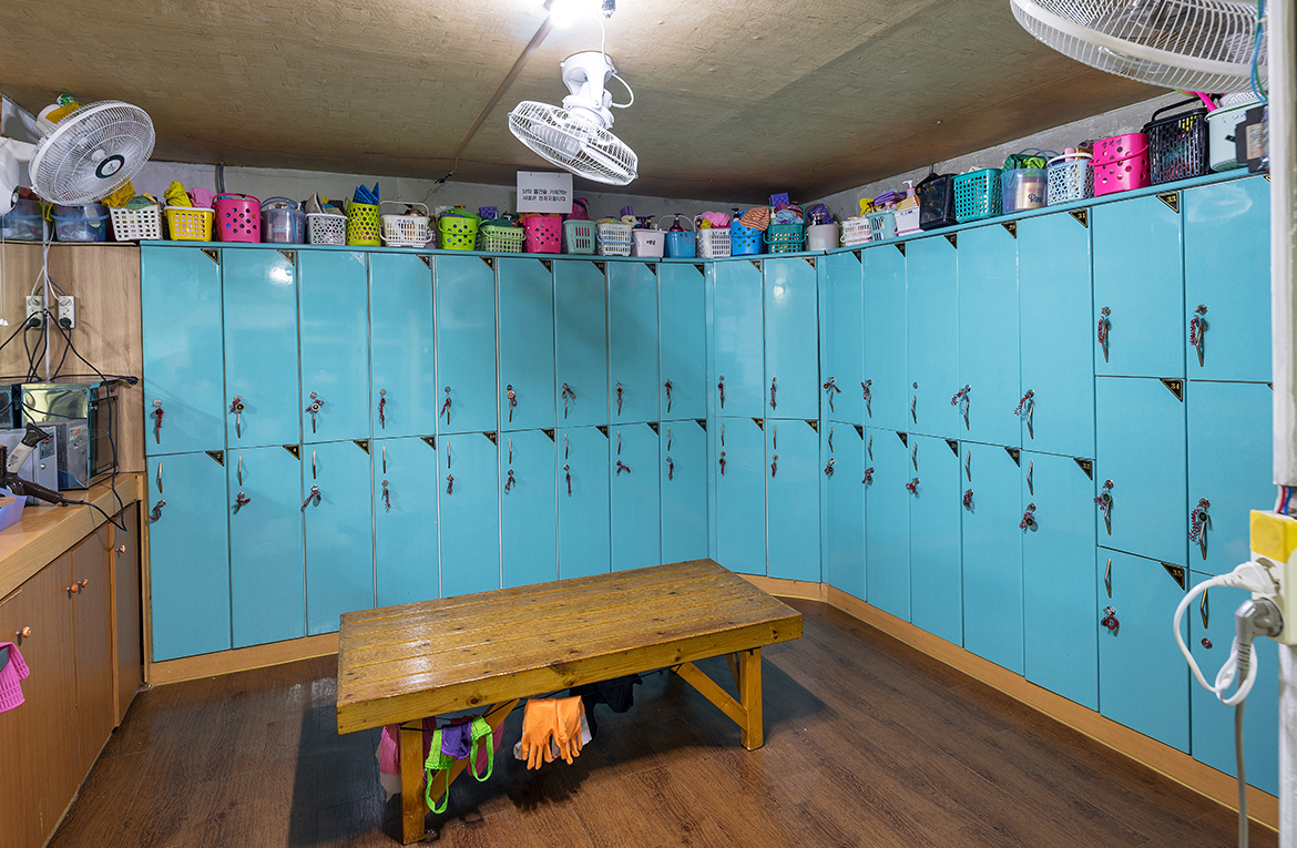 여탕 탈의실을 들어서자마자 눈에 들어 온 것은 목욕바구니의 행렬이었다. 거의 매일 목욕을 오는 사람들이 목욕용품을 바구니에 담아 보관해 둔 것이 캐비닛 위에 빼곡하게 쌓여 있었다. 매일 목욕을 오는 사람들은 10회 또는 20회 단위로 목욕권을 끊어 목욕탕을 이용한다고 한다. 재미있는 것은 목욕바구니에 적힌 바구니 주인의 이름이었다. ‘OO엄마’ 또는 ‘OO네’ 같은 이름을 벗고 자기가 운영하는 가게 이름이나, ‘OO언니’처럼 자기 자신을 표현하는 명칭들을 볼 수 있었다.
