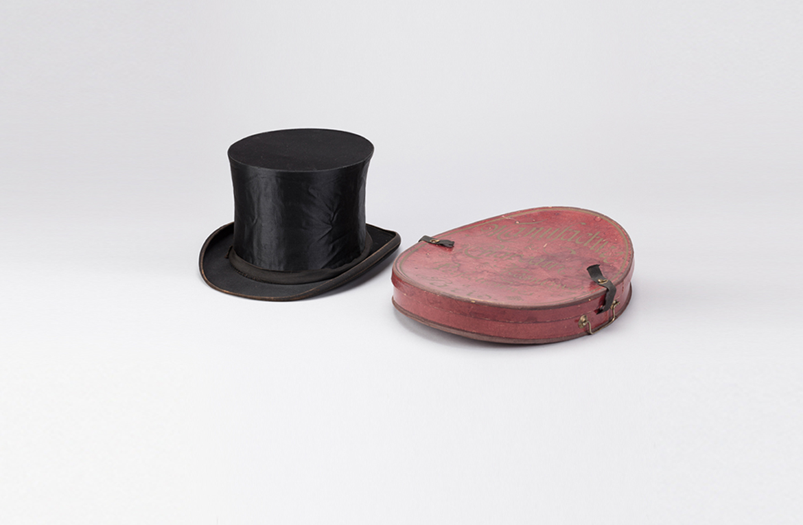 - 진사고모_프랑스제 실크 탑 햇으로 진사고모 또는 실크해트라 한다. 몸체가 접혀져 납작한 종이상자 안에 보관할 수 있고, 모자챙의 곡선 형태를 유지할 수 있도록 상자의 형태가 유선형으로 휘어져 있다.