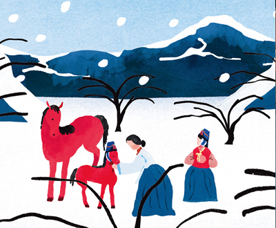 두 명의 아이와 새해 나들이하는 여인의 모습이 묘사되어 있다.