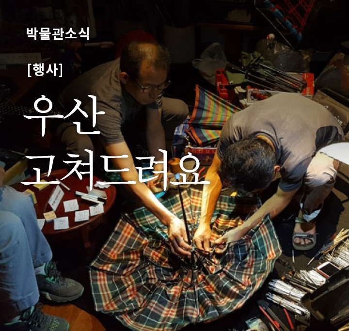 [행사] 우산 고쳐드려요 Gallery [행사] 우산 고쳐드려요 Legacy, 박물관 소식, 박물관, 지금 [행사] 우산 고쳐드려요 국립민속박물관 기획전시실에서 열리는 ‘쓰레기X사용설명서’ 전시장에서는 7월 22일(토)부터 8월 12일(토)까지 매주 [...] By dintro_admin|2018-03-12T19:44:01+09:002017년 7월 25일|Legacy, 박물관 소식, 박물관, 지금|2 Comments Read More